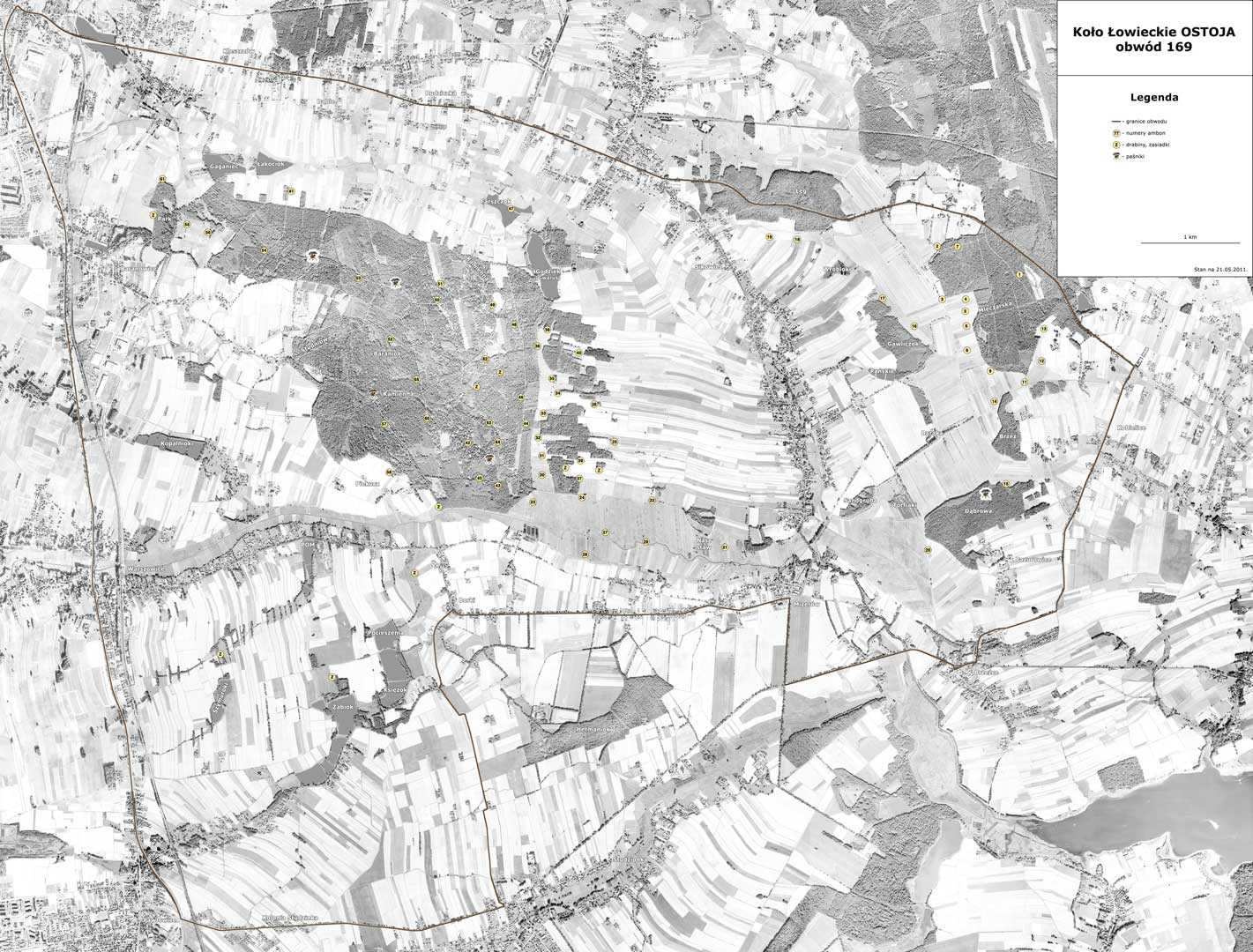 Na te mapy naniosłem ambony itd. Tym razem była to już praca łatwiejsza, a miejscowi myśliwi dostali gotową wydrukowaną mapę w formacie A0, tylko do sprawdzenia i ewentualnej korekty lokalizacji urządzeń łowieckich.