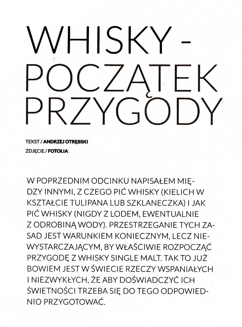 W poprzednim odcinku napisałem między innymi, z czego pić whisky (kielich w kształcie tulipana lub szklaneczka) i jak pić whisky (nigdy z lodem). Przestrzeganie tych zasad jest warunkiem koniecznym, lecz niewystarczającym, by właściwie rozpocząć przygodę z whisky Single Malt. Tak to już bowiem jest w świecie rzeczy wspaniałych i niezwykłych, że aby doświadczyć ich świetności trzeba się do tego odpowiednio przygotować.