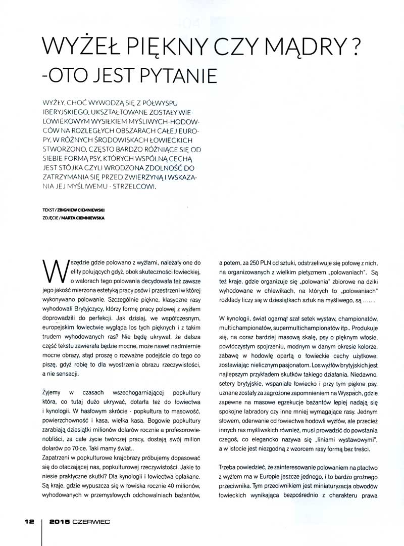 Wyżły, choć wywodzą się z Półwyspu Iberyjskiego, ukształtowane zostały wielowiekowym wysiłkiem myśliwych-hodowców na rozległych obszarach całej Europy. W różnych środowiskach łowieckich stworzono, często bardzo różniące się od siebie formą psy, których wspólną cechą jest stójka czyli wrodzona zdolność do zatrzymania się przed zwierzyną i wskazania jej myśliwemu - strzelcowi. Wszędzie gdzie polowano z wyżłami, należały one do elity polujących gdyż, obok skuteczności łowieckiej, o walorach tego polowania decydowała też zawsze jego jakość mierzona estetyką pracy psów i przestrzeni w której wykonywano polowanie. Szczególnie piękne, klasyczne rasy wyhodowali Brytyjczycy, którzy formę pracy polowej z wyżłem doprowadzili do perfekcji. Jak dzisiaj, we współczesnym, europejskim łowiectwie wygląda los tych pięknych i z takim trudem wyhodowanych ras? Nie będę ukrywał, że dalsza część tekstu zawierała będzie mocne, może nawet nadmiernie mocne obrazy, stąd proszę o rozważne podejście do tego co piszę, gdyż robię to dla wyostrzenia obrazu rzeczywistości, a nie sensacji.