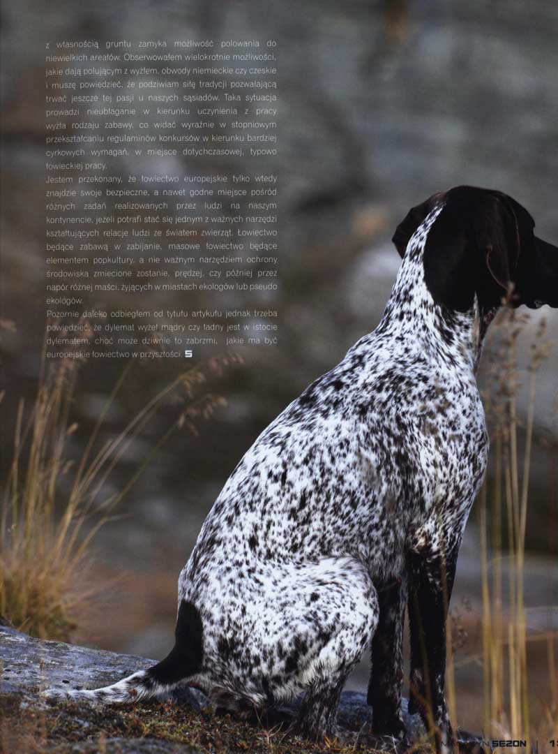 Trzeba powiedzieć, że zainteresowanie polowaniem na ptactwo z wyżłem, ma w Europie jeszcze jednego, i to bardzo groźnego przeciwnika. Tym przeciwnikiem jest miniaturyzacja obwodów łowieckich wynikająca bezpośrednio z charakteru prawa łowieckiego w różnych krajach, gdzie związanie łowiectwa z własnością gruntu zamyka możliwość polowania do niewielkich areałów. Obserwowałem wielokrotnie możliwości, jakie dają polującym z wyżłem, obwody niemieckie czy czeskie i muszę powiedzieć, że podziwiam siłę tradycji pozwalającą trwać jeszcze tej pasji u naszych sąsiadów. Taka sytuacja prowadzi nieubłaganie w kierunku uczynienia z pracy wyżła rodzaju zabawy, co widać wyraźnie w stopniowym przekształcaniu regulaminów konkursów w kierunku bardziej cyrkowych wymagań, w miejsce dotychczasowej, typowo łowieckiej pracy.