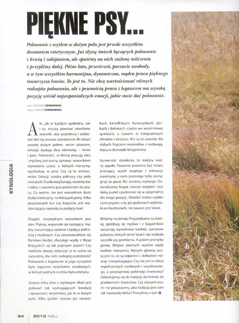 Polowanie z wyżłem w dużym polu jest przede wszystkim wydarzeniem estetycznym. Już słyszę śmiech łączących polowanie z krwią i zabijaniem, ale spuśćmy na nich zasłonę i dalej w temat. Dojrzałe lato, przestrzeń, poczucie swobody a w tym wszystkim harmonijna, dynamiczna, mądra praca pięknego towarzysza łowów. To jest to. Nie chcę wartościować różnych rodzajów polowania ale z pewnością praca z legawcem ma swoje miejsce wśród najwspanialszych emocji które polowanie może dać. Jednak, jak w każdym spektaklu, tak i tu, muszą zostać stworzone warunki aby uczestnicy i widzowie dali się porwać zdarzeniom. W spektaklu zwanym dużym polem, moim zdaniem, podstawę emocji budują dwa warunki – teren i pies. Przestrzeń w której pracuje pies i myśliwy jest sceną, jest oprawą i jest warunkiem uruchomienia emocji o których marzymy wychodząc w pole. Czy są to wrzosowiska Szkocji, tundra północy czy pola i nieużytki Środkowej Europy musimy dać i sobie i naszemu psu przestrzeń do pracy. Co ważne, nie jest warunkiem duża ilość zwierzyny na którą polujemy. Parę zdobytych kur czy kogutów jest wystarczającą nagrodą za podjęty trud. Drugim bezwzględnie potrzebnym do wypełnienia warunkiem jest pies. Pies piękny, wspaniale się ruszający, mądry, rozumiejący zadanie i tworzący z myśliwym jedną całość. Czy myśleliście Państwo kiedyś dlaczego wyżły z Wysp Brytyjskich są tak pięknymi psami? Czy mieliście okazję zobaczyć je w ruchu, na naturalnej dla nich, rozległej przestrzeni? Polowanie z legawcem w ich ojczyźnie było zajęciem szlachetnie urodzonych, zajęciem w którym estetyka była jednym z celów. Jeszcze kilka słów o myśliwym. Mało jest polowań tak wymagających kondycji i sprawności strzeleckiej jak polowanie w dużym polu. Kilka godzin marszu po nieużytkach, kartofliskach, buraczyskach, górkach i dolinkach, często we wrześniowej spiekocie a czasem w listopadowym chłodzie i deszczu. Nie są to zawody dla słabych fizycznie nemrodów z nadwagą idącą w dziesiątki kilogramów. Sprawność strzelecka – kolejny temat. Pozornie powinno być prosto, pracujący wyżeł znajduje i wskazuje nam zwierzynę a nam pozostaje tylko pociągnąć za spust. Nic bardziej błędnego. Doświadczony kogut zawsze znajdzie nasz słaby punkt, zawsze podniesie się w optymalnej dla niego pozycji, strzelać trzeba szybko i precyzyjnie a to po godzinach wędrówki po bezdrożach nie zawsze jest łatwe. Wróćmy na ziemię. Przyjeżdżamy na zbiórkę, zjeżdżają się myśliwi i z różnych bagażników zaczynają wyskakiwać kudłate, szarobure potwory których sierść latami nie widziała szczotki czy grzebienia. A potem jest tylko gorzej. Miejsce pięknych wyżłów zajęły kudłate mieszańce których główną zaletą jest to, że są odporne i delikatnie mówiąc niewymagające. Czy nie jest to obraz współczesnych myśliwych i współczesnego, przynajmniej polskiego, łowiectwa? Odwołujemy się do tradycji, do historii, do pradawności łowiectwa. Czy naszymi psami nie pokazujemy jaka tradycja jest nam tak naprawdę bliska? Pomyślmy o tym.