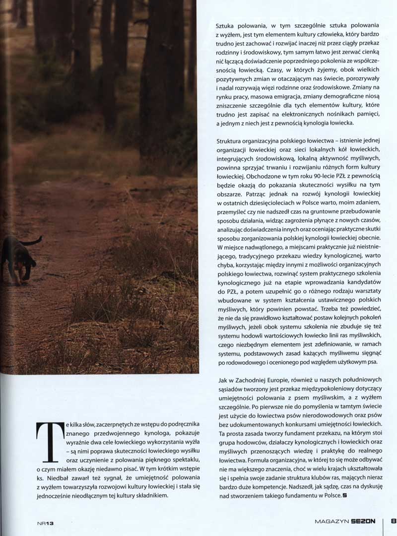 Struktura organizacyjna polskiego łowiectwa - istnienie jednej organizacji łowieckiej oraz sieci lokalnych kół łowieckich integrujących środowiskową, lokalną aktywność myśliwych, powinna sprzyjać trwaniu i rozwijaniu różnych form kultury łowieckiej. Obchodzone w tym roku 90-lecie PZŁ z pewnością będzie okazją do pokazania skuteczności wysiłku na tym obszarze. Patrząc jednak na rozwój kynologii łowieckiej w ostatnich dziesięcioleciach w Polsce warto, moim zdaniem, przemyśleć czy nie nadszedł czas na gruntowne przebudowanie sposobu działania, widząc zagrożenia płynące z nowych czasów, analizując doświadczenia innych oraz oceniając praktyczne skutki sposobu zorganizowania polskiej kynologii łowieckiej obecnie. W miejsce nadwątlonego, a miejscami praktycznie już nie istniejącego, tradycyjnego przekazu wiedzy kynologicznej warto chyba, korzystając między innymi z możliwości organizacyjnych polskiego łowiectwa rozwinąć system praktycznego szkolenia kynologicznego już na etapie wprowadzania kandydatów do PZŁ a potem uzupełnić go o różnego rodzaju warsztaty wbudowane w system kształcenia ustawicznego polskich myśliwych, który powinien powstać. Trzeba też powiedzieć, że nie da się prawidłowo kształtować postaw kolejnych pokoleń myśliwych, jeżeli obok systemu szkolenia nie zbuduje się też systemu hodowli wartościowych łowiecko linii ras myśliwskich, czego niezbędnym elementem jest zdefiniowanie, w ramach systemu, podstawowych zasad każących myśliwemu sięgnąć po rodowodowego i ocenionego pod względem użytkowym psa.