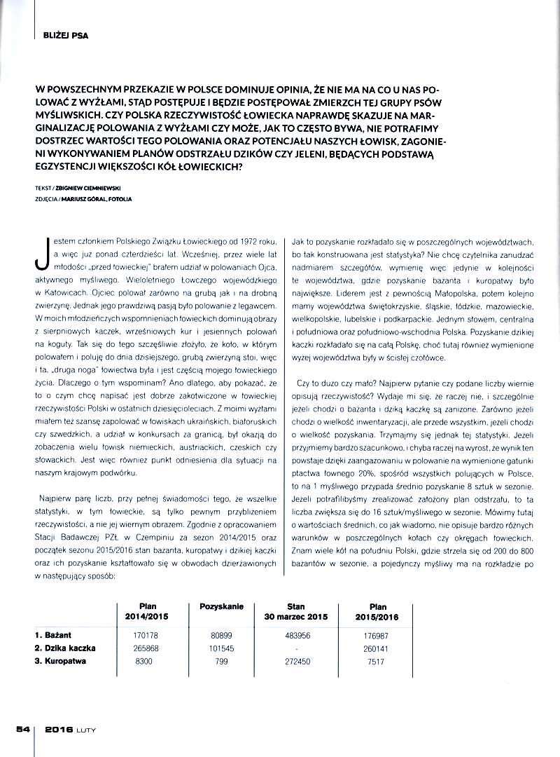 Jestem członkiem Polskiego Związku Łowieckiego od 1972 roku, a więc już ponad czterdzieści lat. Wcześniej, przez wiele lat młodości „przed łowieckiej” brałem udział w polowaniach Ojca, aktywnego myśliwego, wieloletniego Łowczego Wojewódzkiego w Katowicach, w czasach gdy istniały jeszcze „wielkie województwa”. Ojciec aktywnie polował zarówno na grubą jak i na drobną zwierzynę, jednak jego prawdziwą pasją było polowanie z legawcem. W ówczesnym województwie katowickim były wspaniałe stany kuropatw i kaczek oraz całkiem dobre bażantów, stąd w moich młodzieńczych wspomnieniach łowieckich dominują obrazy z sierpniowych kaczek, wrześniowych kur i jesiennych polowań na koguty. Tak się do tego szczęśliwie złożyło, że koło w którym polowałem i poluję do dnia dzisiejszego, grubą zwierzyną stoi, więc i ta, „druga noga” łowiectwa była i jest częścią mojego łowieckiego życia. Dlaczego o tym wspominam? Ano dlatego, aby pokazać, że to o czym chcę napisać jest dobrze zakotwiczone w łowieckiej rzeczywistości Polski w ostatnich dziesięcioleciach. Z moimi wyżłami miałem też szansę zapolować w łowiskach ukraińskich, białoruskich czy szwedzkich, a udział w konkursach za granicą, był okazją do zobaczenia wielu łowisk niemieckich, austriackich, czeskich czy słowackich. Jest więc również punkt odniesienia dla sytuacji na naszym krajowym podwórku.
