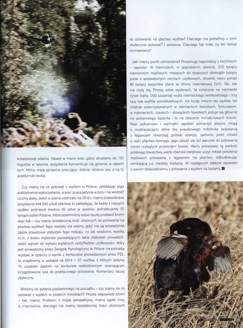 Jaki mamy punkt odniesienia? Proponuję najprostszy z możliwych – sąsiedzi. W Niemczech, w poprzednim sezonie, 370 tysięcy niemieckich myśliwych, mających do dyspozycji dziesiątki tysięcy psów o sprawdzonych cechach użytkowych, strzeliło nieco ponad 80 tysięcy bażantów (dane ze strony internetowej DJV). Tak, tak nie mylę się. Proszę sobie wyobrazić, że corocznie na niemiecki rynek trafia 1200 szczeniąt wyżła niemieckiego krótkowłosego i trzy razy tyle wyżłów szorstkowłosych, nie licząc innych ras wyżłów, też chętnie wykorzystywanych w niemieckich łowiskach. Tymczasem, w niemieckich, czeskich i słowackich łowiskach poluje się głównie na wolierowego bażanta i to na obszarze miniaturowych łowisk i nasi południowi i zachodni sąsiedzi pomarzyć jedynie mogą o możliwościach, które dla prawdziwego miłośnika polowania z legawcem stwarzają polskie obwody, zarówno jeżeli chodzi o ilość ptactwa łownego, jego jakość ale też warunki do polowania wśród rozległych przestrzeni łowisk. Warto pokazywać tą wartość polskiego łowiectwa, warto również cierpliwie uczyć młode pokolenie myśliwych polowania z legawcem na ptactwo, odbudowując zanikającą już niestety tradycję. W następnym tekście opowiem o swoim doświadczeniu z polowania z wyżłem na bażanty.