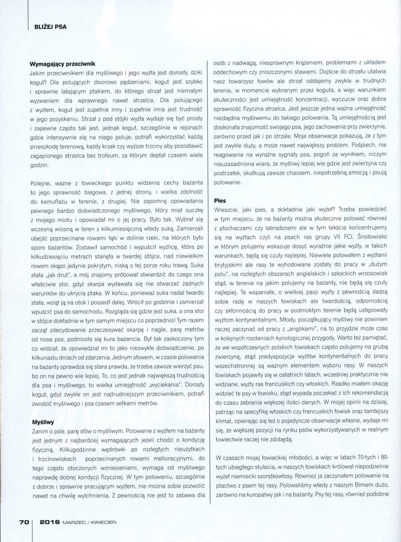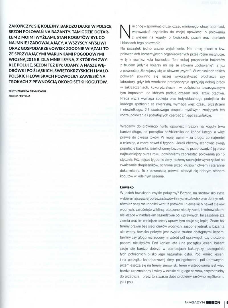 Zakończył się kolejny, bardzo długi w Polsce, sezon polowań na bażanty. Tam gdzie dotarłem z moimi wyżłami, stan kogutów był co najmniej zadowalający, a wszyscy myśliwi oraz gospodarze łowisk zgodnie wiązali to ze sprzyjającymi warunkami pogodowymi wiosną 2015 r. Dla mnie i syna, z którym zwykle poluję, sezon też był udany, a nasze wędrówki po śląskich, świętokrzyskich i małopolskich łowiskach pozwoliły zawiesić na trokach z pewnością około setki kogutów. Nie chcę wspominać dłużej czasu minionego, chcę natomiast, wprowadzić czytelnika do mojej opowieści o polowaniu z wyżłem na koguty, o łowiskach, psach oraz cieniach i blaskach tego polowania.