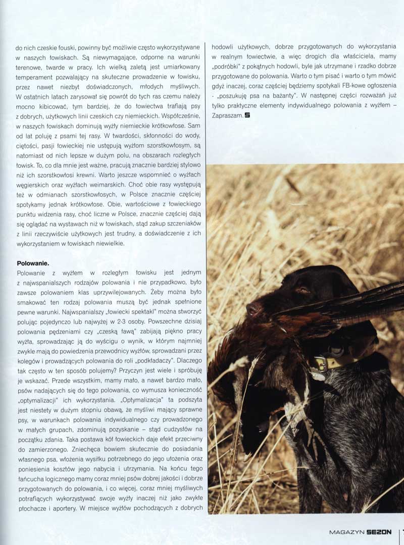 W czasach mojej łowieckiej młodości, a więc w latach 70-tych i 80-tych ubiegłego stulecia, w naszych łowiskach królował niepodzielnie wyżeł niemiecki szorstkowłosy. Również ja zaczynałem polowanie na ptactwo z psem tej rasy. Polowaliśmy wtedy z naszym Bimem dużo, zarówno na kuropatwy jak i na bażanty. Psy tej rasy, również podobne do nich czeskie fouski, powinny być możliwie często wykorzystywane w naszych łowiskach. Są niewymagające, odporne na warunki terenowe, twarde w pracy. Ich wielką zaletą jest umiarkowany temperament pozwalający na skuteczne prowadzenie w łowisku, przez nawet niezbyt doświadczonych, młodych myśliwych. W ostatnich latach zarysował się powrót do tych ras czemu należy mocno kibicować, tym bardziej, że do łowiectwa trafiają psy z dobrych, użytkowych linii czeskich czy niemieckich. Współcześnie, w naszych łowiskach dominują wyżły niemieckie krótkowłose. Sam od lat poluję z psami tej rasy. W twardości, skłonności do wody, ciętości, pasji łowieckiej nie ustępują wyżłom szorstkowłosym, są natomiast od nich lepsze w dużym polu, na obszarach rozległych łowisk. To, co dla mnie jest ważne, pracują znacznie bardziej stylowo niż ich szorstkowłosi krewni. Warto jeszcze wspomnieć o wyżłach węgierskich oraz wyżłach weimarskich. Choć obie rasy występują też w odmianach szorstkowłosych, w Polsce znacznie częściej spotykamy ich wersje krótkowłose. Obie, wartościowe z łowieckiego punktu widzenia rasy, choć liczne w Polsce, znacznie częściej dają się oglądać na wystawach niż w łowiskach, stąd zakup szczeniaków z linii rzeczywiście użytkowych jest trudny, a doświadczenie z ich wykorzystaniem w naszych łowiskach niewielkie.