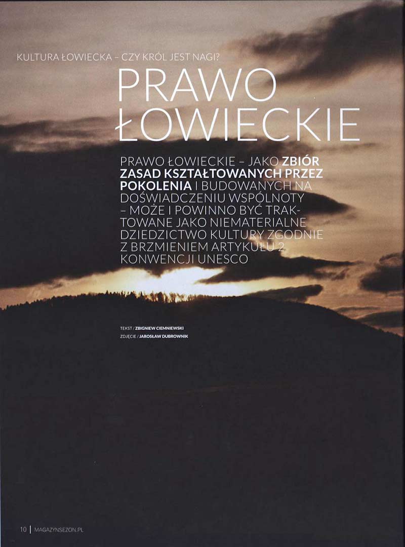 Zapewne większość ludzi poszukując jednoznacznej, a najlepiej prostej, definicji pojęcia „prawo” dozna kolorowego zawrotu głowy. Sprawa nie jest wcale prosta. Niedawno słyszałem ciekawą rozmowę z wybitnym fizykiem, który przywołał wypowiedź Tomasza z Akwinu dotyczącą pozornie równie oczywistego pojęcia jakim jest czas. Św. Tomasz powiedział, że „.. co to jest czas wszyscy wiedzą, do czasu, kiedy dostaną takie pytanie …”. Do mnie, na użytek tego tekstu, trafia proste określenie tego czym jest prawo. Brzmi ono - prawo jest zespołem reguł ustanowionych bądź uznanych przez odpowiednie organy państwa, które poparte są przymusem państwowym. Myślę, że prawo łowieckie, o którym chcę pisać, dobrze wpisuje się w to określenie. W naszym (myśliwych) przypadku ten zespół reguł określa przestrzeń dla realizacji zadania jakim jest łowiectwo. Prawo łowieckie, jako zbiór zasad kształtowanych przez pokolenia, budowanych na doświadczeniu wspólnoty może i powinno być traktowane jako niematerialne dobro kultury zgodnie z brzmieniem artykułu 2 Konwencji UNESCO.