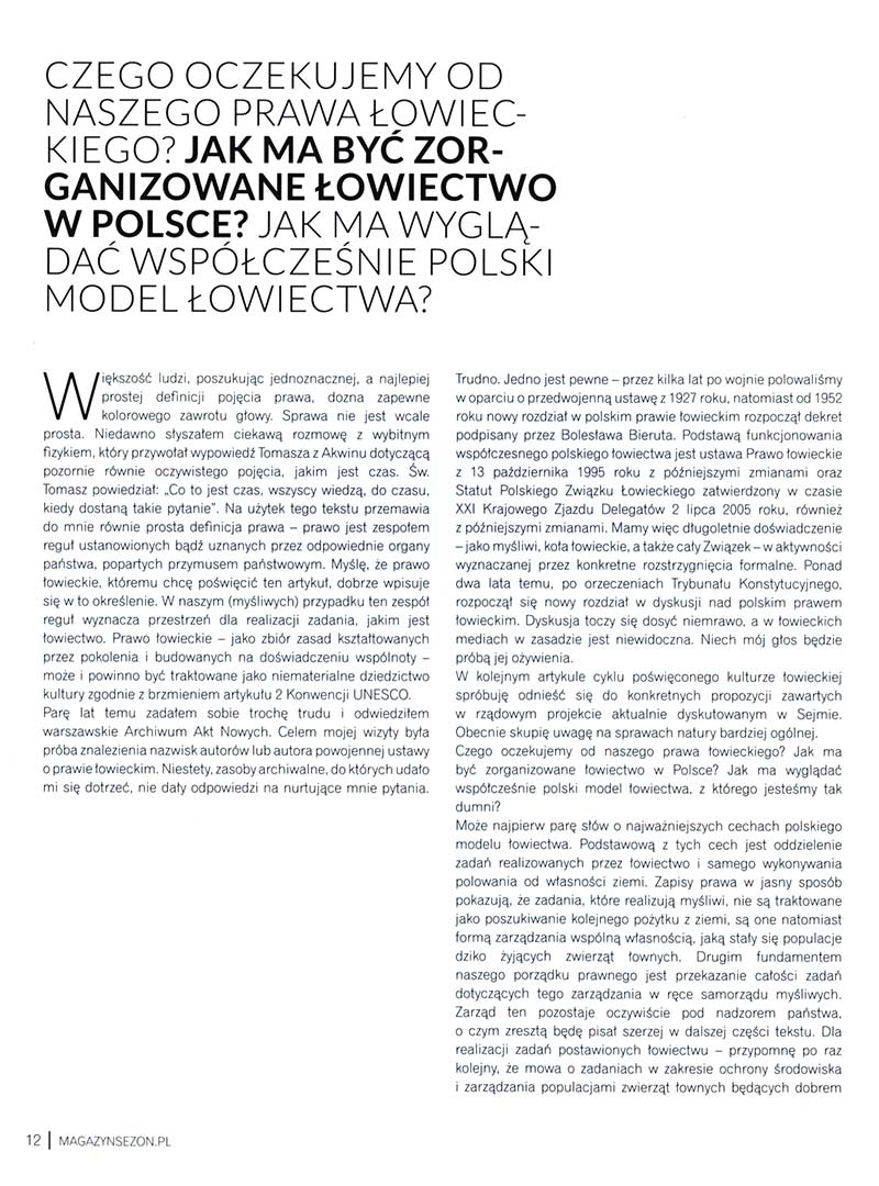 Parę lat temu zadałem sobie trochę trudu odwiedzając warszawskie Archiwum Akt Nowych. Celem mojego wyjazdu była próba znalezienia nazwisk ludzi/zespołu który był autorem powojennego Prawa Łowieckiego. Niestety, zasoby archiwalne do których udało mi się dotrzeć nie dały odpowiedzi na nurtujące mnie pytania. Trudno. Jedno jest pewne, przez kilka lat po wojnie polowaliśmy w oparciu o przedwojenną ustawę z 1927 r., natomiast od 1952 r. Dekret podpisany przez Bolesława Bieruta rozpoczął nowy rozdział w polskim prawie łowieckim. Współczesne polskie łowiectwo zorganizowane jest w oparciu o Ustawę Prawo Łowieckie z 13.10.1995 z późniejszymi zmianami i Statut PZŁ zatwierdzony w czasie XXI Krajowego Zjazdu Delegatów 2 lipca 2005 również z późniejszymi zmianami. Mamy więc długoletnie doświadczenie, zarówno jako myśliwi, jako koła łowieckie, jak też cały Związek w aktywności pod zarządem ówczesnych rozstrzygnięć formalnych. Od ponad 2 lat, po orzeczeniach Trybunału Konstytucyjnego rozpoczął się nowy rozdział dyskusji nad polskim prawem łowieckim. Dyskusja toczy się dosyć niemrawo, a w łowieckich mediach w zasadzie jest niewidoczna. Niech mój głos będzie próbą jej ożywienia.