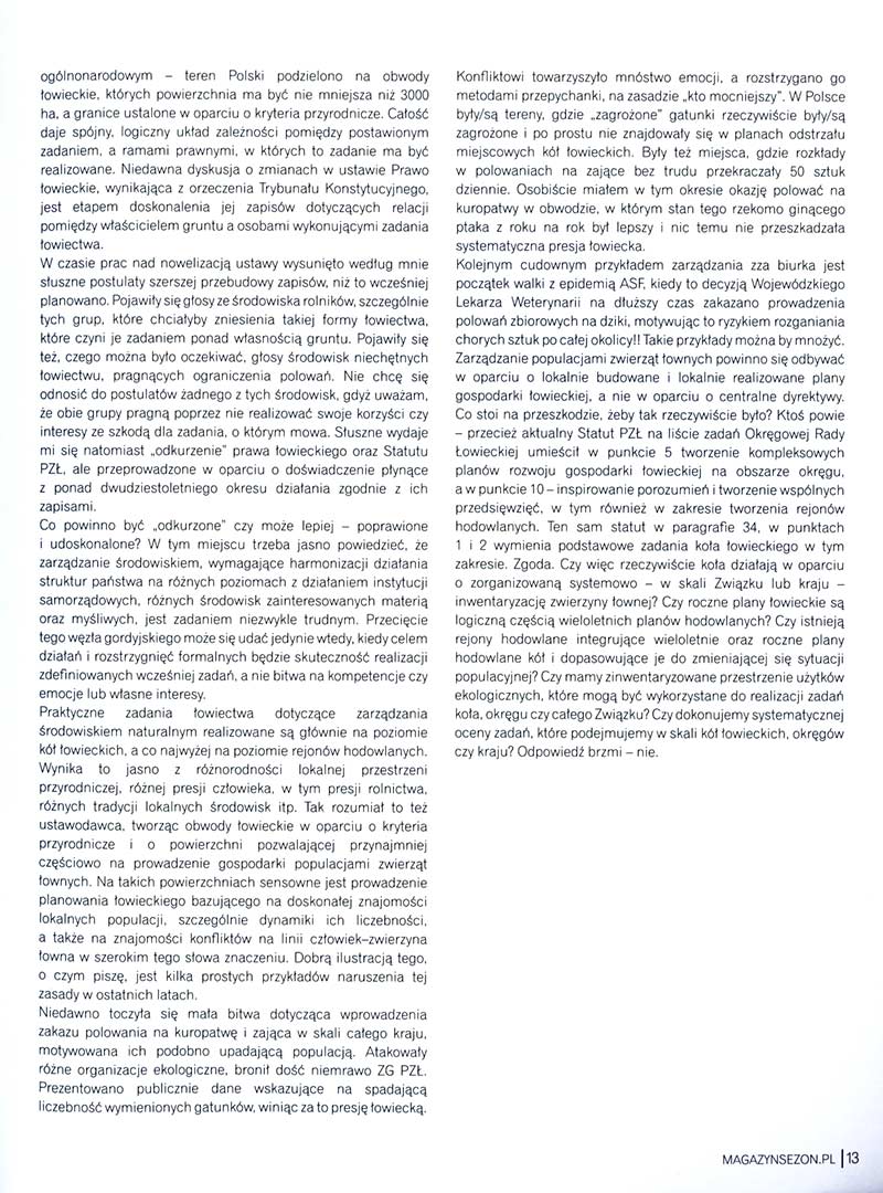 Może najpierw parę słów o najważniejszych cechach polskiego modelu łowiectwa. Podstawową jego cechą jest to, że oddzielono zadania realizowane przez łowiectwo oraz samo wykonywanie polowania od własności ziemi. W jasny sposób pokazano w zapisach prawa, że zadania które realizują myśliwi nie są traktowane jako poszukiwanie kolejnego pożytku z ziemi, są one natomiast formą zarządzania wspólną własnością z jakiej uczyniono populacje dziko żyjących zwierząt łownych. Drugim fundamentem naszego porządku prawnego jest przekazanie całości zadań w zakresie tego zarządu w ręce samorządu myśliwych. Zarząd ten pozostaje oczywiście pod nadzorem państwa, o czym zresztą będę szerzej pisał w dalszej części. Konsekwentnie, dla realizacji zadań postawionych łowiectwu, przypomnę kolejny raz, zadań w zakresie ochrony środowiska i zarządzania populacjami zwierząt łownych będących dobrem ogólnonarodowym, teren Polski podzielono na obwody łowieckie. Obwody których powierzchnia ma być nie mniejsza niż 3000 ha, a granice ustalone w oparciu o kryteria przyrodnicze. Całość daje spójny, logiczny układ zależności pomiędzy postawionym zadaniem, a ramami prawnymi w których to zadanie ma być realizowane. Ostatnia, wynikająca z orzeczenia Trybunału Konstytucyjnego dyskusja o zmianach prawa łowieckiego jest etapem doskonalenia jego zapisów dotyczących relacji pomiędzy właścicielem gruntu, a wykonującymi zadania łowiectwa.
