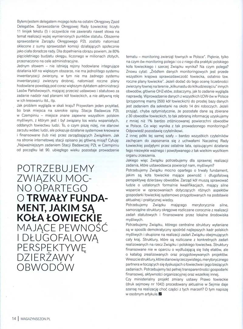 Potrzebujemy Związku mocno opartego o trwały fundament jakim są koła łowieckie, mające pewność i długofalową perspektywę dzierżawy obwodów. Zarząd kół muszą sprawować ludzie o zdefiniowanych formalnie kwalifikacjach, mający silne wsparcie w systemowo przygotowanych, opartych o aktualną, praktyczną wiedzę opracowaniach dotyczących różnych aspektów gospodarki łowieckiej.