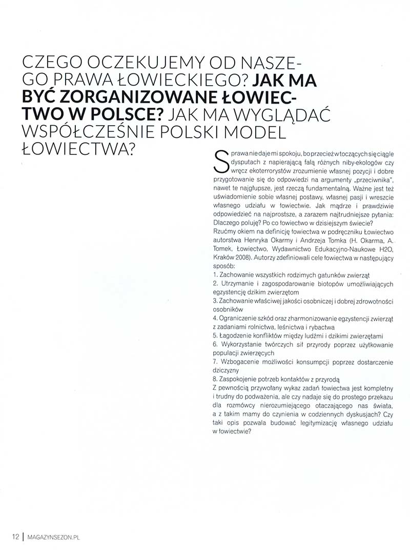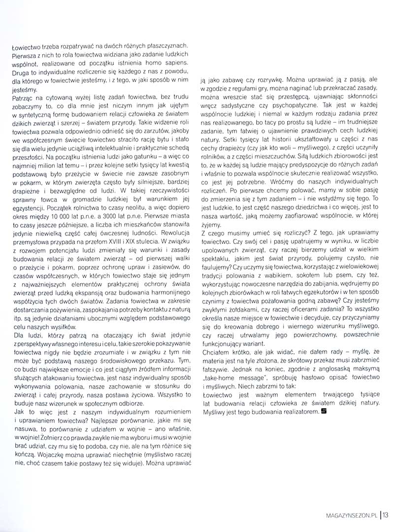 Są dwie różne płaszczyzny na których trzeba o łowiectwie pisać. Pierwsza z nich, to rola łowiectwa widziana jako zadanie ludzkich wspólnot, zadanie realizowanego od początku istnienia homo sapiens. Druga to indywidualne rozliczenie się każdego z nas z powodu dla którego w łowiectwie jesteśmy, i w jaki sposób w nim jesteśmy.